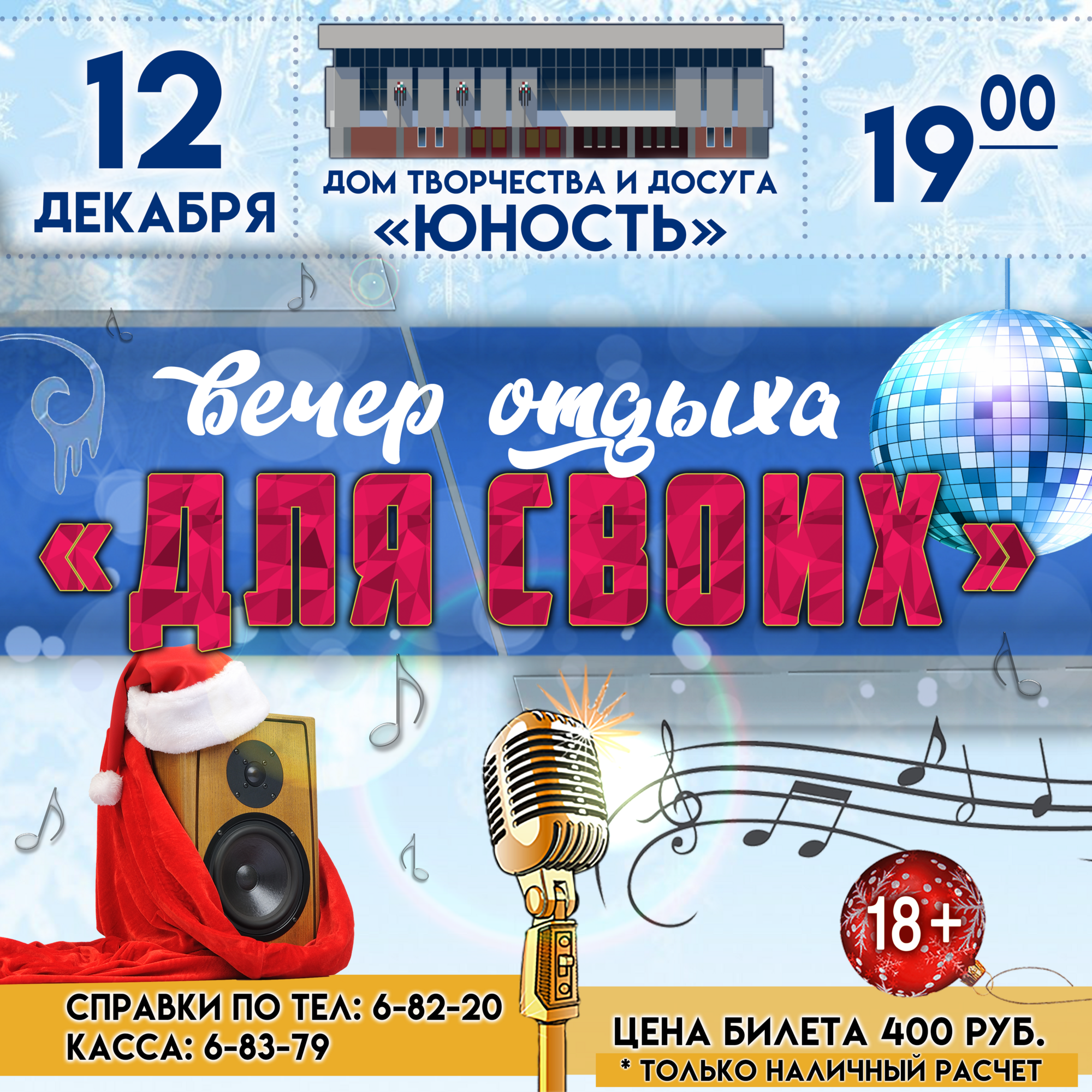 Дорогие друзья, внимание! Только представьте: концертная программа, захватывающий интерактив с залом, зажигательная дискотека, фотозона и море позитива ждут вас 12 декабря в 19:00 на вечере отдыха «ДЛЯ СВОИХ» ! Отличное настроение гарантировано!