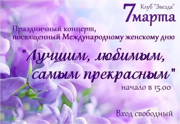 📅 7 марта, в 15:00, двери клуба "Звезда" откроются для вас, любимых и прекрасных дам, чтобы подарить яркие эмоции и душевное тепло.
