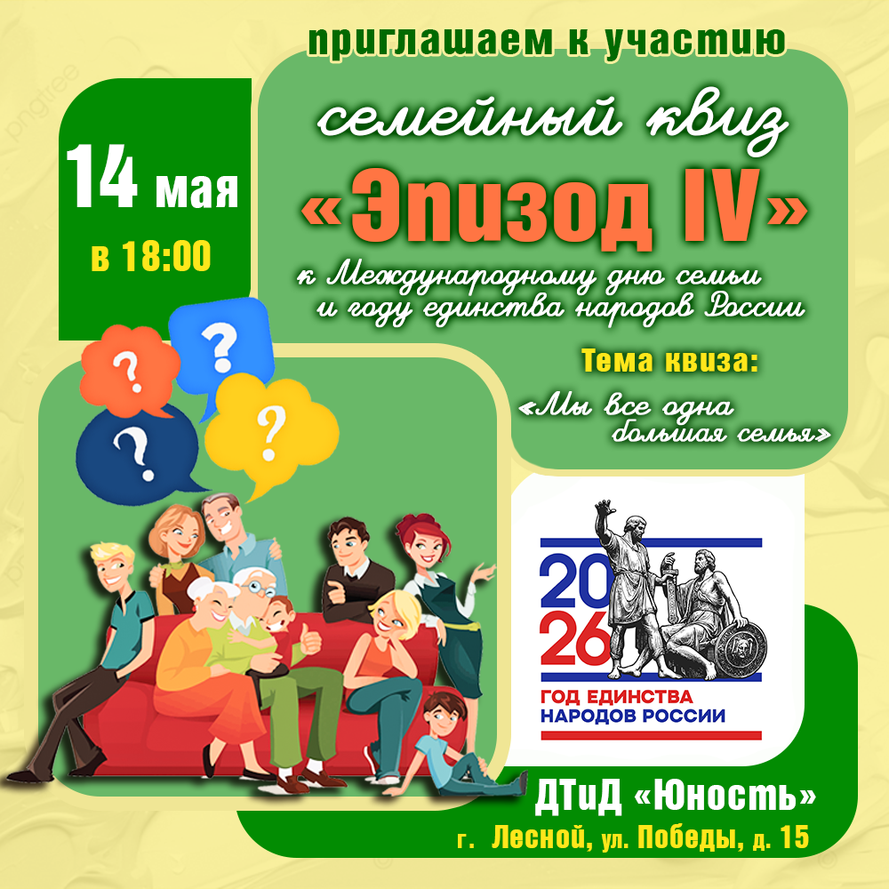 Готовы к битве умов и весёлому семейному вечеру? Приглашаем семейные команды из городских организаций и творческих объединений, а также все желающие семьи принять участие в семейном квизе «ЭПИЗОД IV» — интеллектуально-развлекательном событии, посвящённом Дню семьи и году единства народов России!