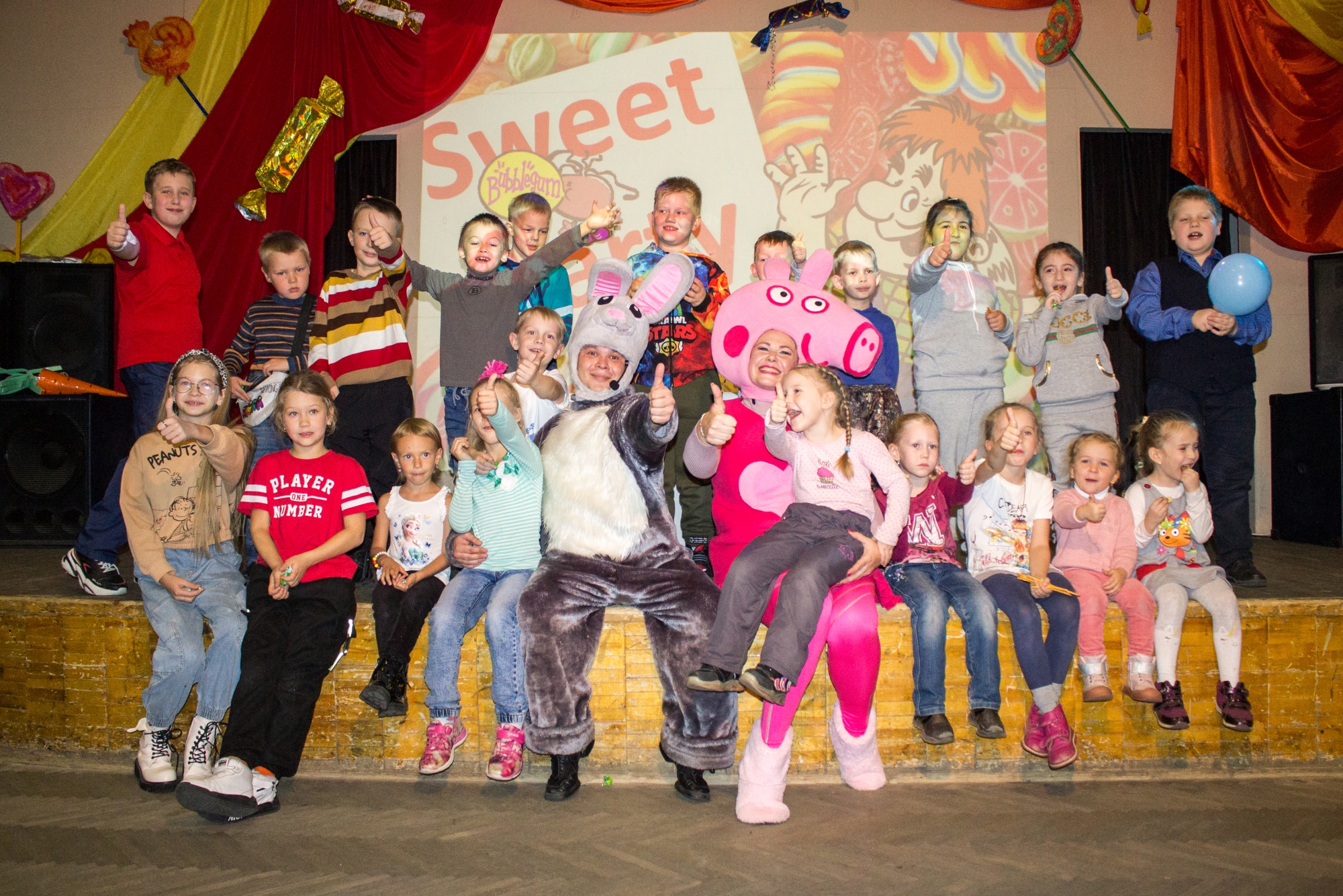 Любительница конфет Свинка Пеппа и озорной Заяц приготовили сюрпризы для ребят! Все желающие смогли поиграть, потанцевать, ответить на вопросы сладкой викторины и, конечно, угоститься Конфетами, Печеньем, Яблоками на веревочках, Кукурузными палочками, Сладкой соломкой, Сгущеным молоком!!!