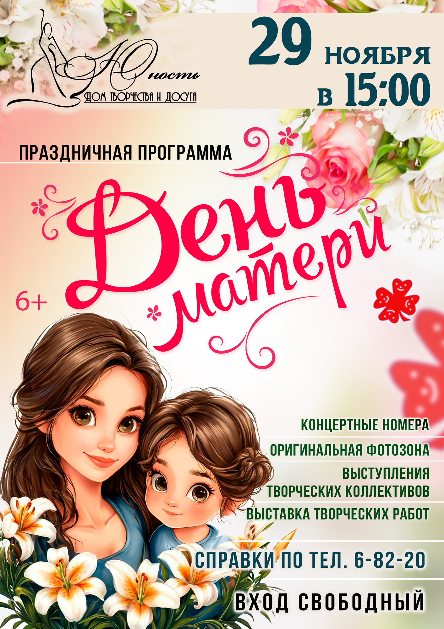 Самый тёплый праздник ноября — День Матери! Приглашаем вас отметить этот замечательный день вместе с нами! В последнюю субботу ноября, 29 ноября, в 15:00, в большом зале Дома творчества и досуга «Юность» пройдёт праздничное мероприятие, посвященное Дню Матери.