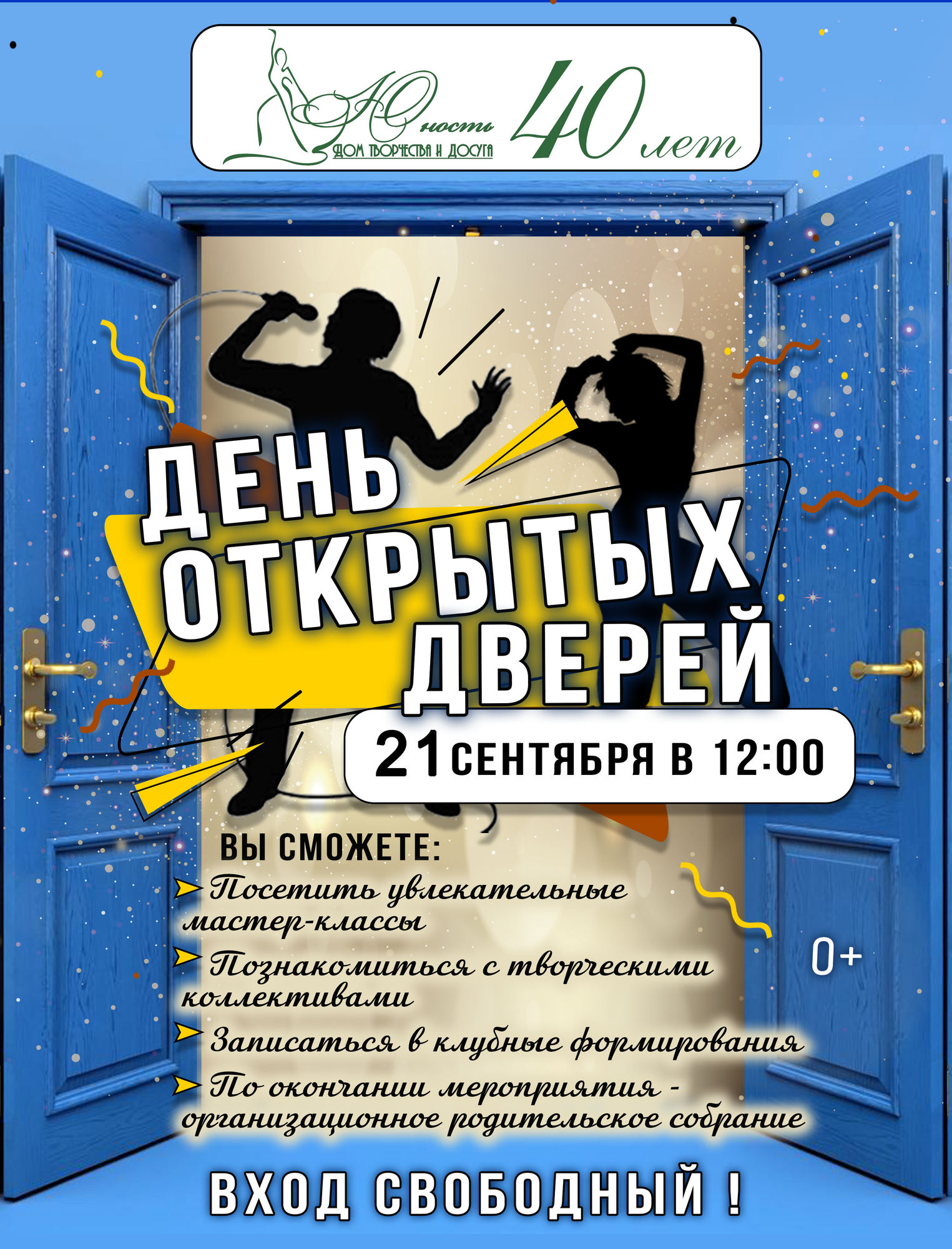 Главная / Новости / Дорогие друзья! Ждем вас 21 сентября в 12.00 на День открытых дверей в Доме творчества и досуга "Юность"‼