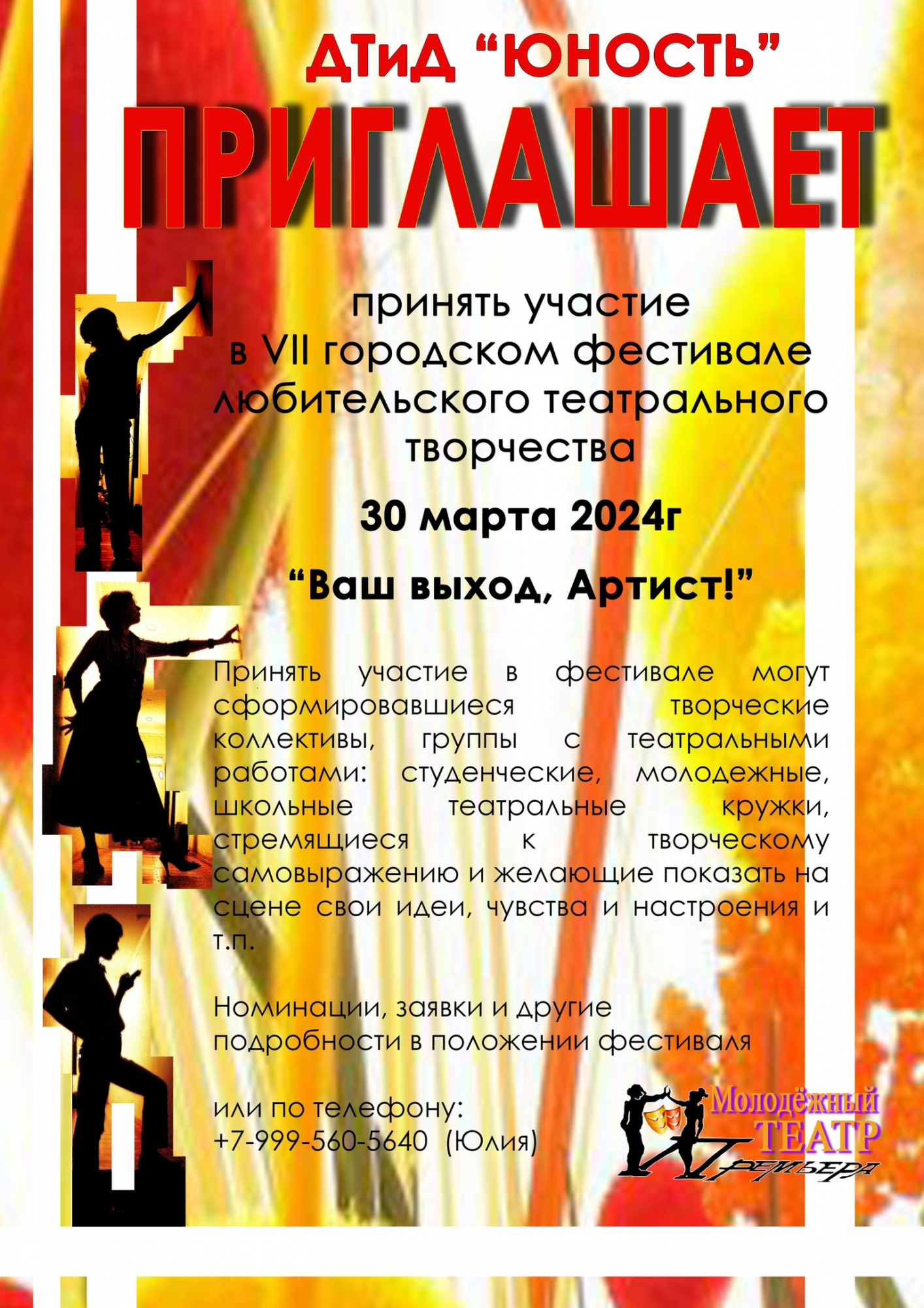Открыт приём заявок на участие во VII городском любительского театрального творчества «ВАШ ВЫХОД, АРТИСТ! - 2024»!