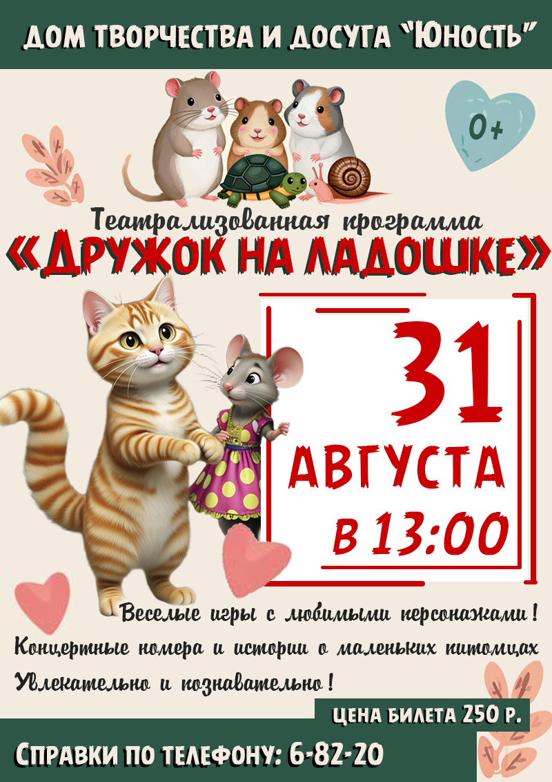 ПРИГЛАШАЕМ детей и родителей на уникальное событие — ТЕАТРАЛИЗОВАННУЮ ПРОГРАММУ «ДРУЖОК НА ЛАДОШКЕ», которая пройдёт 31 августа в 13:00 в большом зале ДТиД «Юность». Вас ждёт море веселья и позитива!