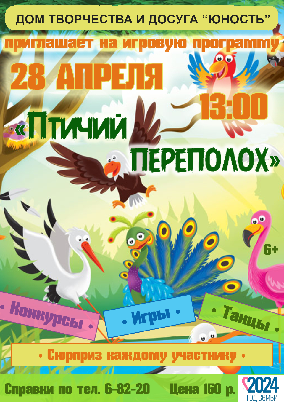 Тогда уже в это воскресенье, 28 апреля, в 13:00 мы ждём вас на игровой программе «ПТИЧИЙ ПЕРЕПОЛОХ»!