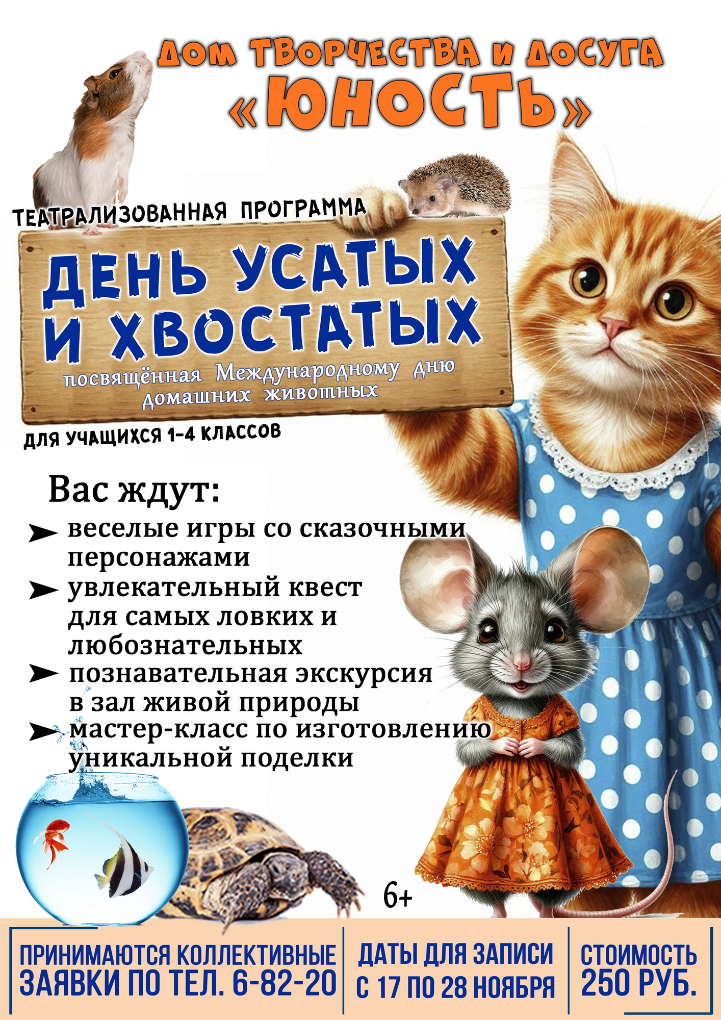 Приглашаем учащихся начальных классов (1-4 классы) на яркую Театрализованную программу «День усатых и хвостатых», посвященную Международному дню домашних животных.
