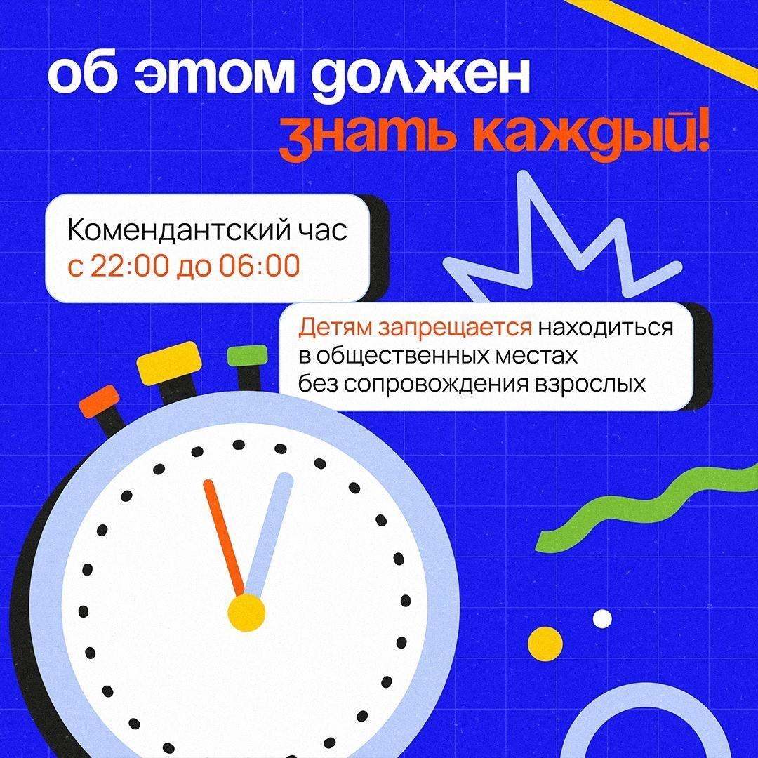 🕙 Помните: В соответствии с Законом Свердловской области № 73-ОЗ от 16.07.2009 г. несовершеннолетним детям, не достигшим 16-летнего возраста, запрещается находиться в общественных местах без сопровождения взрослых в период с 22:00 до 6:00.