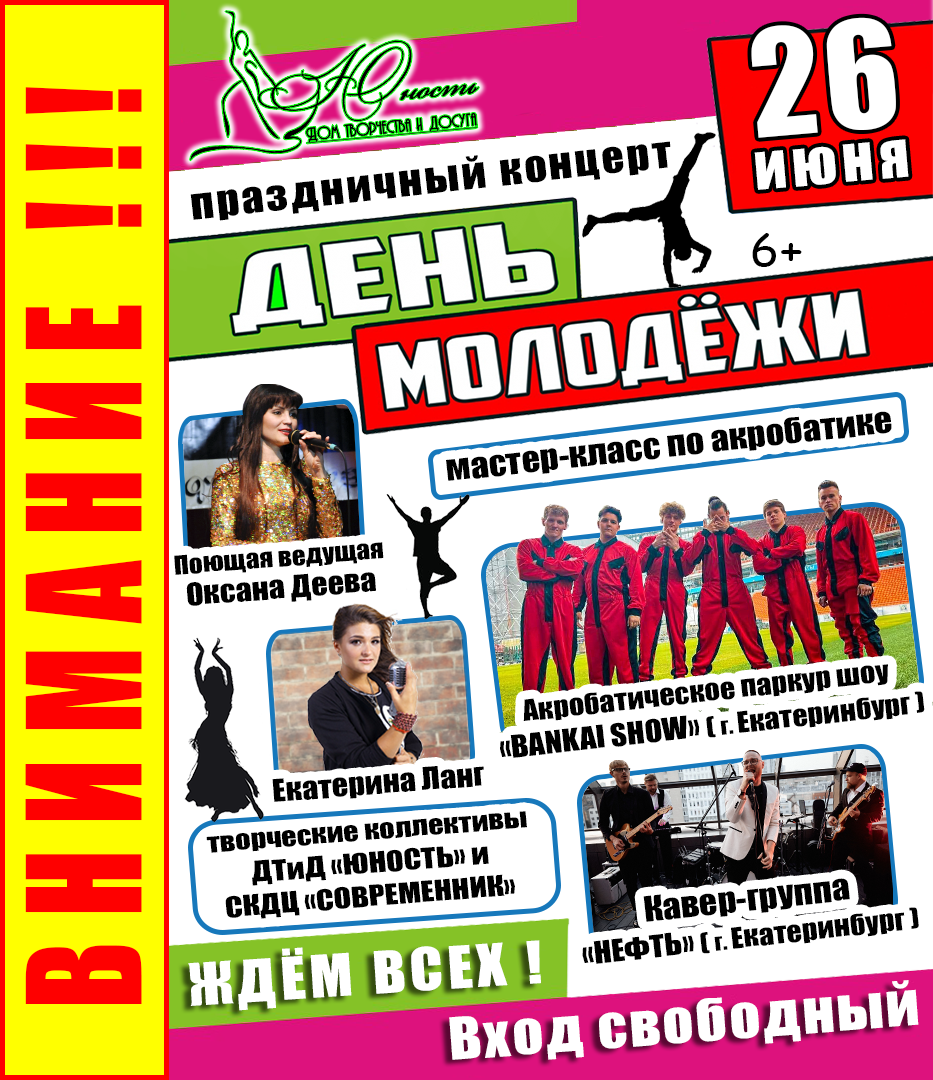 ПРАЗДНИЧНЫЙ КОНЦЕРТ, посвященный Дню Молодёжи, в связи с погодными условиями, СОСТОИТСЯ В БОЛЬШОМ ЗАЛЕ ДТиД «Юность».