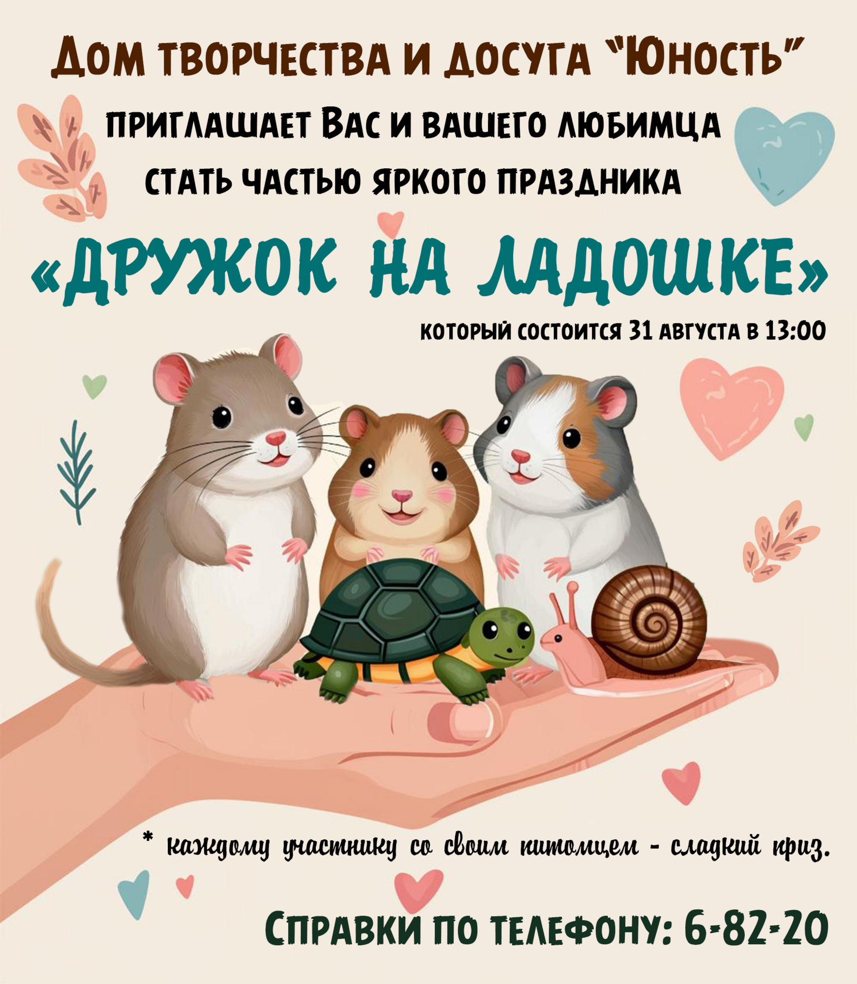 У вашего маленького питомца есть шанс стать звездой нашего праздника «Дружок на Ладошке», где каждый сможет показать своего любимца — будь то пушистый хомячок, забавная морская свинка, элегантная черепашка или очаровательная улитка. Мы ждем всех желающих! Каждому участнику со своим маленьким другом - сладкий приз.