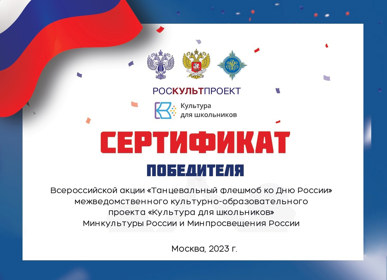 С 8 по 12 июня в рамках межведомственного культурно-образовательного проекта Минкультуры России и Минпросвещения России «Культура для школьников» прошла Всероссийская акция «Танцевальный флешмоб ко Дню России», посвященная одному из главных государственных праздников в стране, символу национального единения. Более 200 тысяч российских школьников приняли участие в этом патриотическом мероприятии.